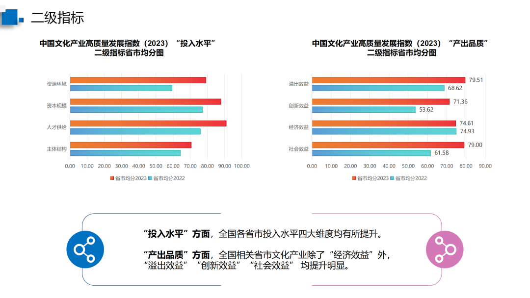 “产出品质”方面,全国相关省市文化产业除了“经济效益”外,“溢出效益”“创新效益”“社会效益”均提升明显。