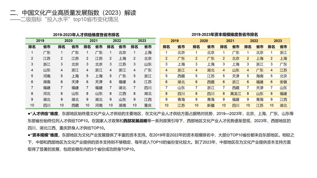 “资本规模”维度,东部地区为文化产业发展提供了丰富的资本支持。在2019年至2022年的资本规模排名中,大部分TOP10省份都来自东部地区。相较之下,中部和西部地区为文化产业提供的资本支持则不够稳定,每年进入TOP10的省份变化较大。到了2023年,中部地区在为文化产业提供资本支持方面取得了显著的发展,包括安徽在内的3个省份成功跻身TOP10。