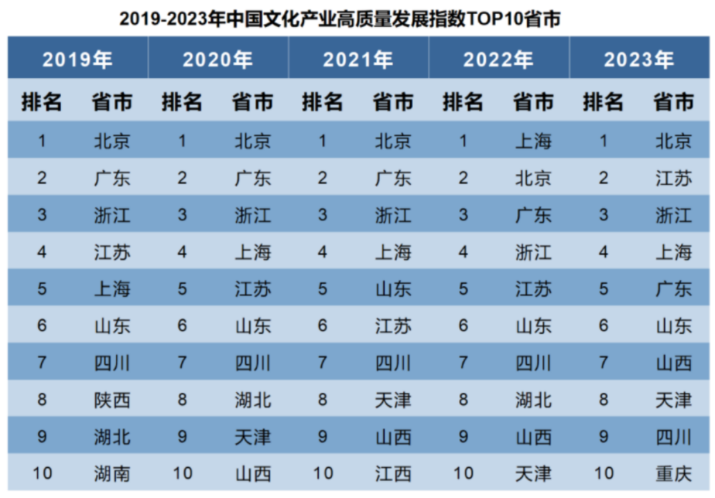 2019-2023年,中国文化产业高质量发展全国排名TOP10榜单整体保持稳定:北京、浙江、江苏、广东、上海等东部地区省市始终稳居中国文化产业高质量发展全国排名TOP10;2023年,中部地区的山西、西部地区的四川依旧位列TOP10。